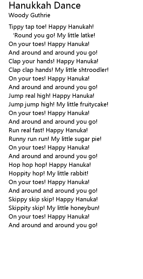 Hanukkah lyrics. Blessings on the menorah ashkenaz traditional tune used to sing the. Lyrics to hanukkah oh hanukkah by glee cast from the glee. The lyrics speak of a childrens toy the dridela four sided spinning top. Hebrew lyrics for hanukkah oh hanukkah.